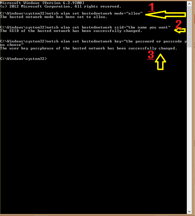 - netsh wlan set hostednetwork key=”the password or pass code you choose” and hit enter.